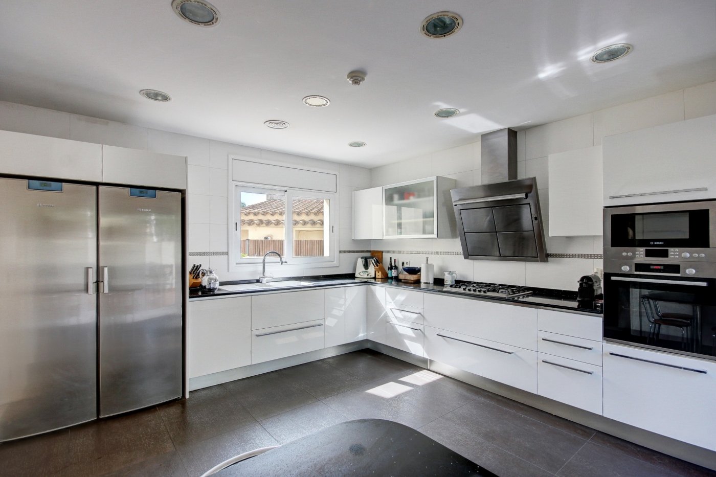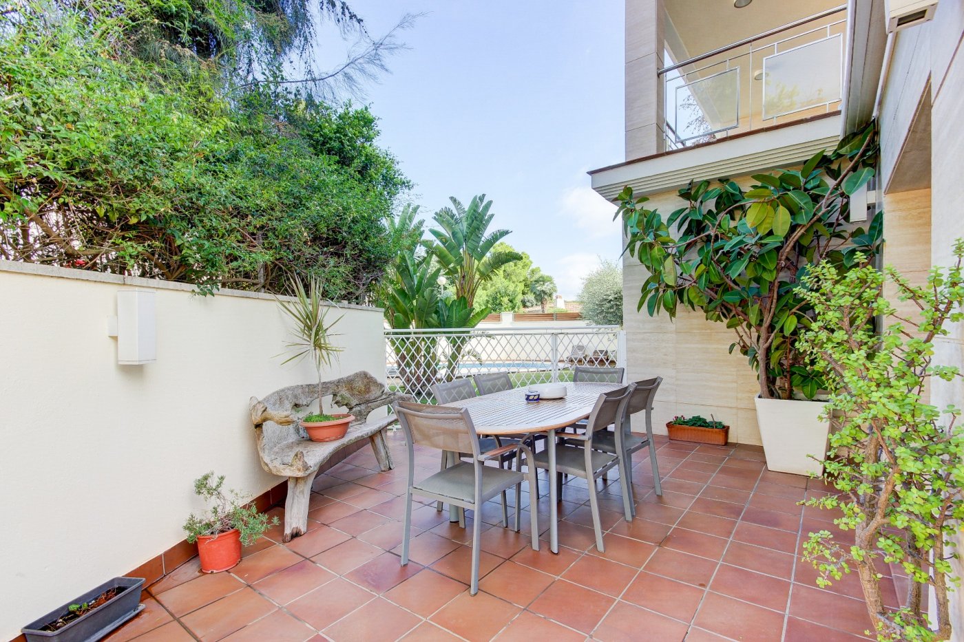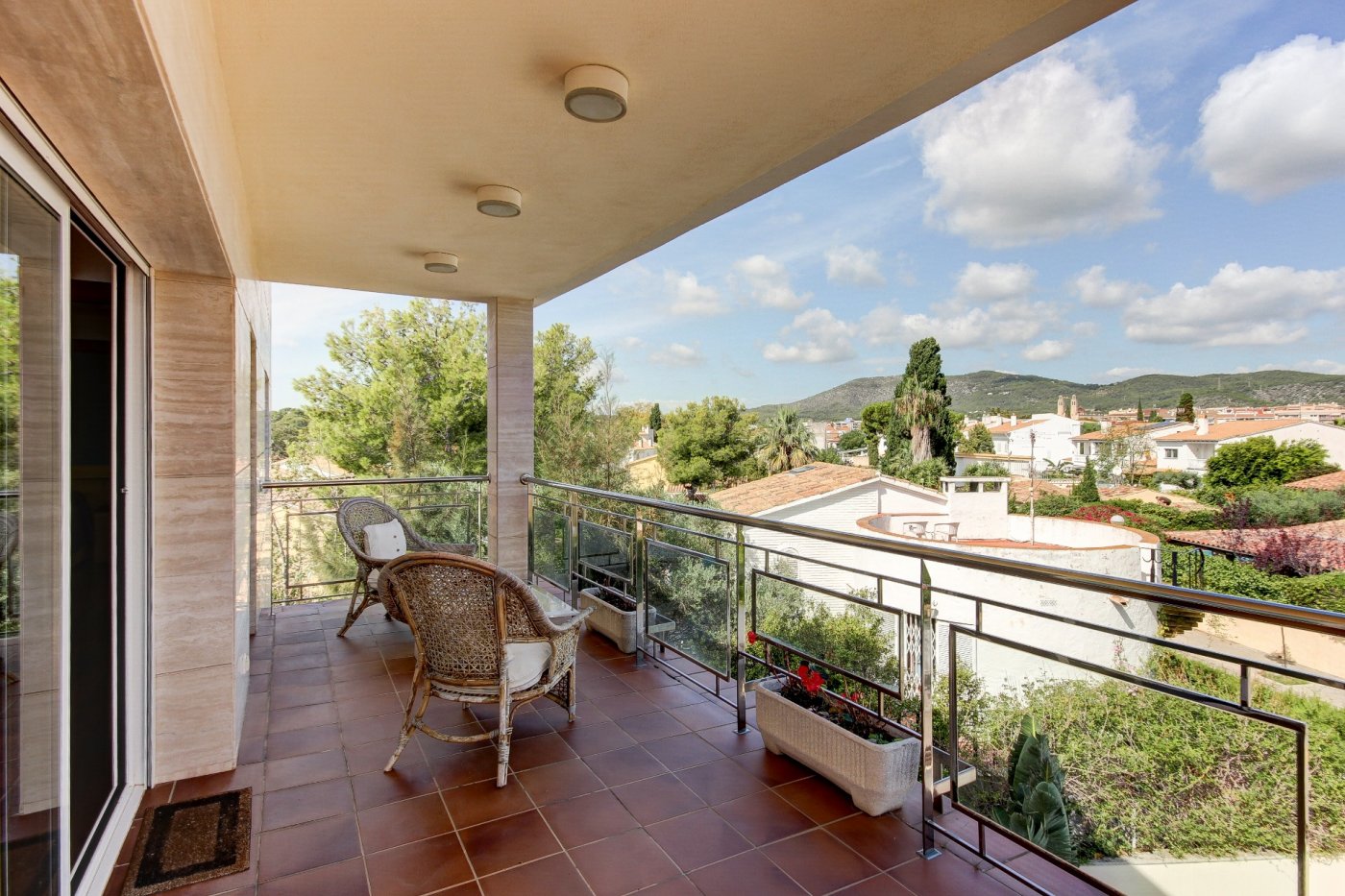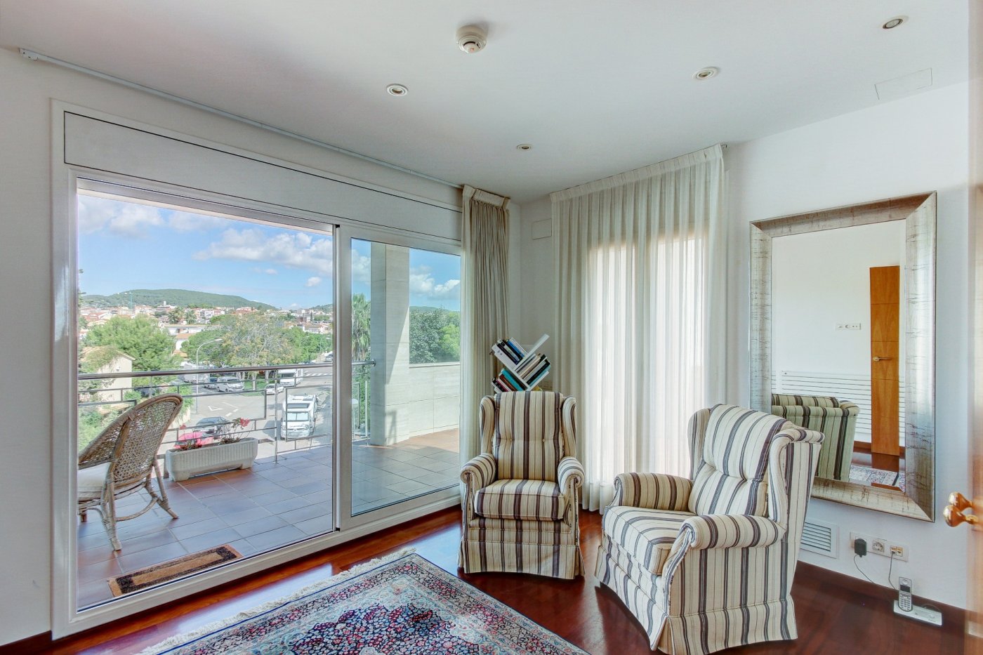 Nous vous présentons cette splendide et élégante maison dans une zone privilégiée de Sant Pere de Ribes.~ Il comporte trois étages et un demi-sous-sol avec un ascenseur entre tous les étages.~ Rez-de-chaussée : nous sommes accueillis par un hall, qui distribue l’espace vers le salon-salle à manger, la cuisine, une chambre, une salle de bain complète et une autre chambre en suite, qui peut être utilisée comme pièce de service. Le salon-salle à manger est spacieux et dispose de trois grandes fenêtres donnant sur le jardin et d’une cheminée vitrée. La cuisine est indépendante et équipée d’une table et de deux fenêtres qui apportent de la lumière. La partie extérieure qui entoure la quasi-totalité de la maison est constituée d’une partie jardin en gazon naturel avec irrigation automatique et d’une piscine dotée d’un système automatique de nettoyage et de contrôle du ph, et l’autre partie extérieure est une terrasse-porche.~ L’accès au premier étage se fait par un escalier en bois à l’allure maritime. Ici, nous trouvons trois chambres extérieures avec des vues agréables, dont une très spacieuse, en suite et actuellement utilisée comme bureau. Deux chambres partagent une salle de bains et ont accès à une terrasse.~ Le dernier étage nous surprend avec un mini appartement : hall-salon, puis un dressing et la chambre principale avec salle de bain avec douche séparée et baignoire avec hydromassage. Les chambres ont accès à une terrasse généreuse qui entoure presque cet étage, où l’on peut se détendre entouré de merveilleuses vues ouvertes aux quatre vents. Des escaliers extérieurs donnent accès à une autre terrasse supérieure où se trouvent certains services, comme la climatisation et les panneaux solaires. ~ Au demi-sous-sol se trouve le garage, avec de la place pour trois voitures, une salle polyvalente (actuellement une petite salle de sport), une salle de bain complète, une cave à vin climatisée, des locaux d’entretien pour la piscine et des fournitures pour la maison.~ Toutes les pièces ont des armoires encastrées, des stores électriques et l’installation électrique est sectorisée.~ Cette maison se caractérise par son design agréable, la majestueuse façade en marbre travertin, combinée au style confortable et accueillant de la construction, et par le confort : vous pourriez emménager demain grâce au soin apporté à l’entretien et aux détails liés aux fournitures.~ L’emplacement est excellent, à côté de la route d’accès aux autoroutes et de l’arrêt de bus pour Sitges et Vilanova.~