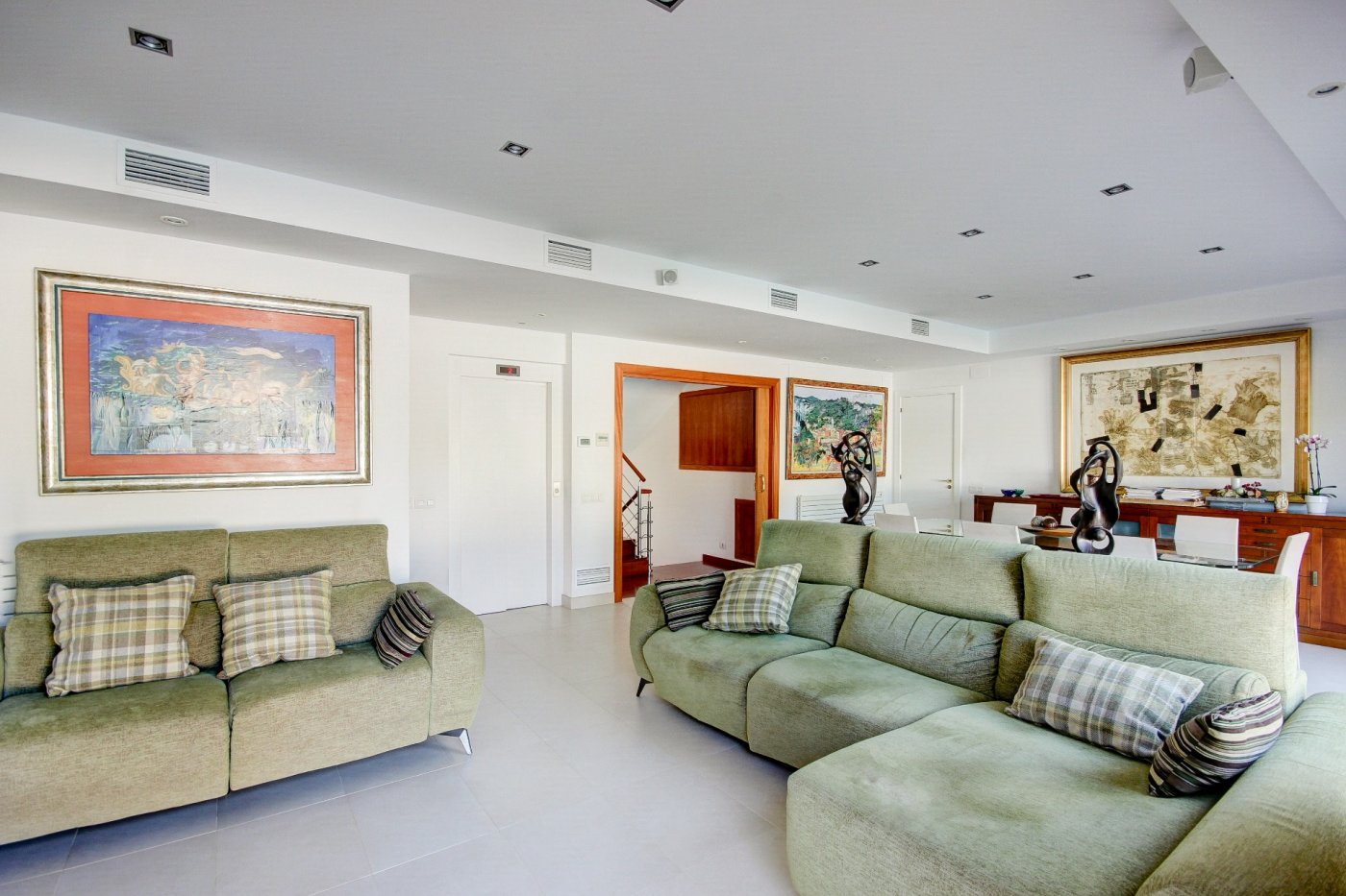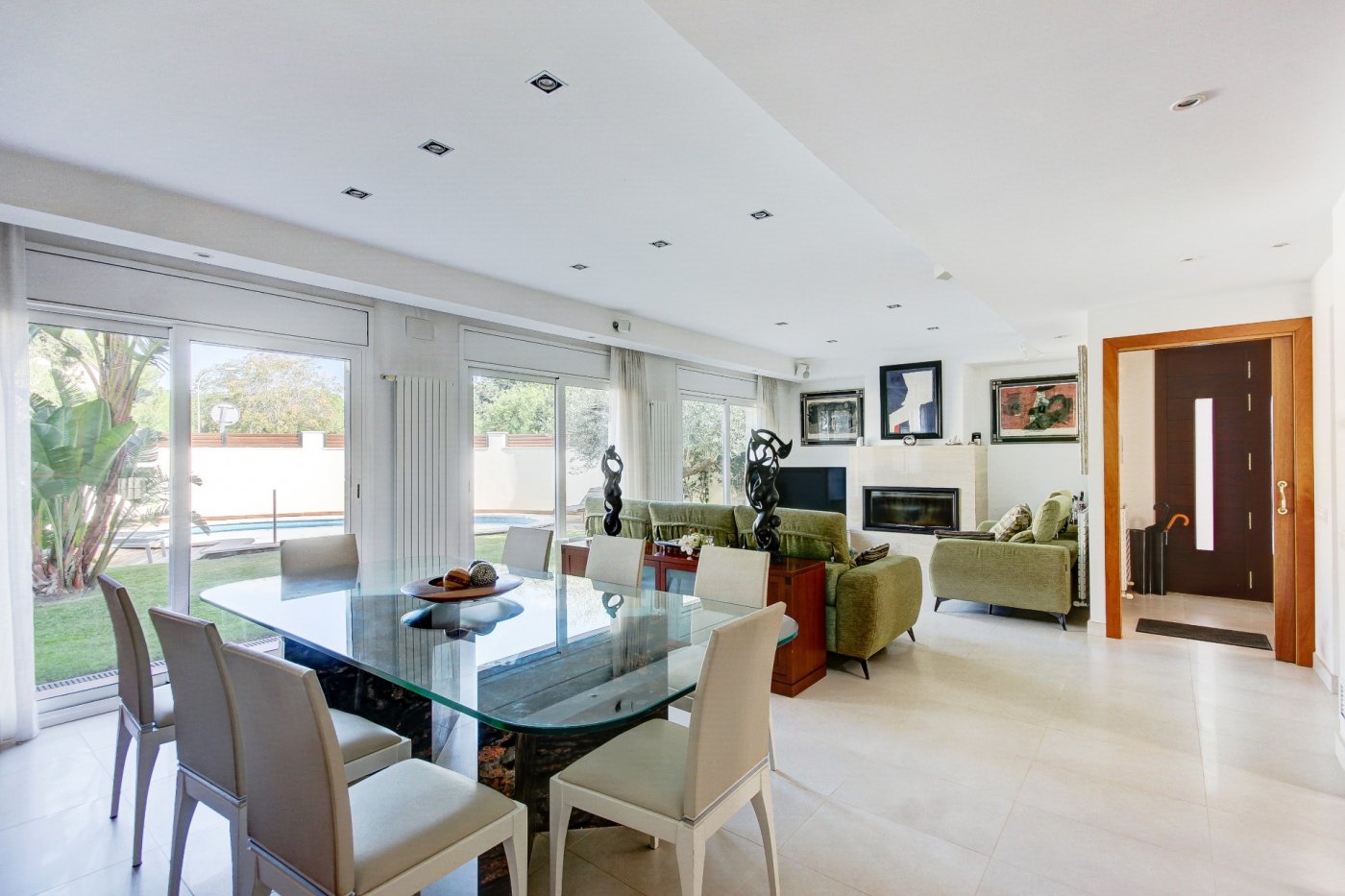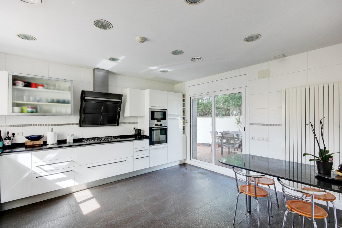 Nous vous présentons cette splendide et élégante maison dans une zone privilégiée de Sant Pere de Ribes.~ Il comporte trois étages et un demi-sous-sol avec un ascenseur entre tous les étages.~ Rez-de-chaussée : nous sommes accueillis par un hall, qui distribue l’espace vers le salon-salle à manger, la cuisine, une chambre, une salle de bain complète et une autre chambre en suite, qui peut être utilisée comme pièce de service. Le salon-salle à manger est spacieux et dispose de trois grandes fenêtres donnant sur le jardin et d’une cheminée vitrée. La cuisine est indépendante et équipée d’une table et de deux fenêtres qui apportent de la lumière. La partie extérieure qui entoure la quasi-totalité de la maison est constituée d’une partie jardin en gazon naturel avec irrigation automatique et d’une piscine dotée d’un système automatique de nettoyage et de contrôle du ph, et l’autre partie extérieure est une terrasse-porche.~ L’accès au premier étage se fait par un escalier en bois à l’allure maritime. Ici, nous trouvons trois chambres extérieures avec des vues agréables, dont une très spacieuse, en suite et actuellement utilisée comme bureau. Deux chambres partagent une salle de bains et ont accès à une terrasse.~ Le dernier étage nous surprend avec un mini appartement : hall-salon, puis un dressing et la chambre principale avec salle de bain avec douche séparée et baignoire avec hydromassage. Les chambres ont accès à une terrasse généreuse qui entoure presque cet étage, où l’on peut se détendre entouré de merveilleuses vues ouvertes aux quatre vents. Des escaliers extérieurs donnent accès à une autre terrasse supérieure où se trouvent certains services, comme la climatisation et les panneaux solaires. ~ Au demi-sous-sol se trouve le garage, avec de la place pour trois voitures, une salle polyvalente (actuellement une petite salle de sport), une salle de bain complète, une cave à vin climatisée, des locaux d’entretien pour la piscine et des fournitures pour la maison.~ Toutes les pièces ont des armoires encastrées, des stores électriques et l’installation électrique est sectorisée.~ Cette maison se caractérise par son design agréable, la majestueuse façade en marbre travertin, combinée au style confortable et accueillant de la construction, et par le confort : vous pourriez emménager demain grâce au soin apporté à l’entretien et aux détails liés aux fournitures.~ L’emplacement est excellent, à côté de la route d’accès aux autoroutes et de l’arrêt de bus pour Sitges et Vilanova.~