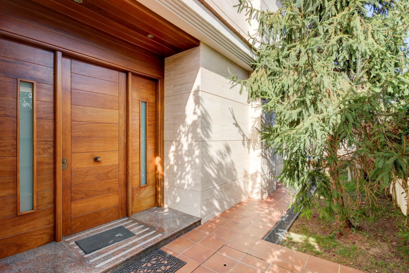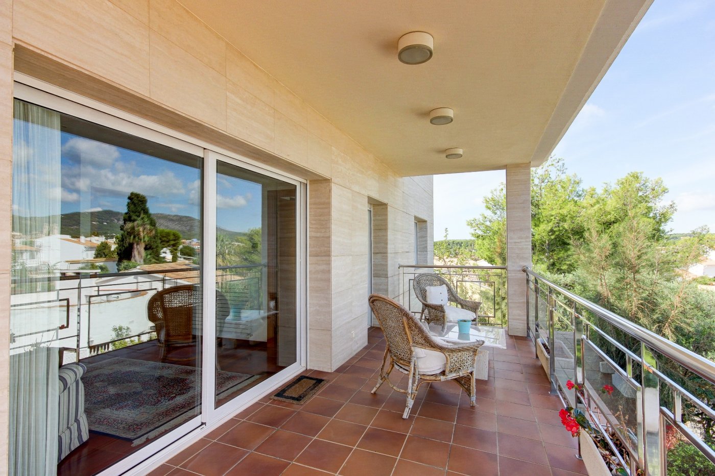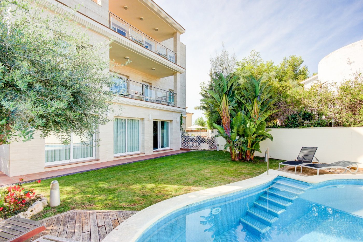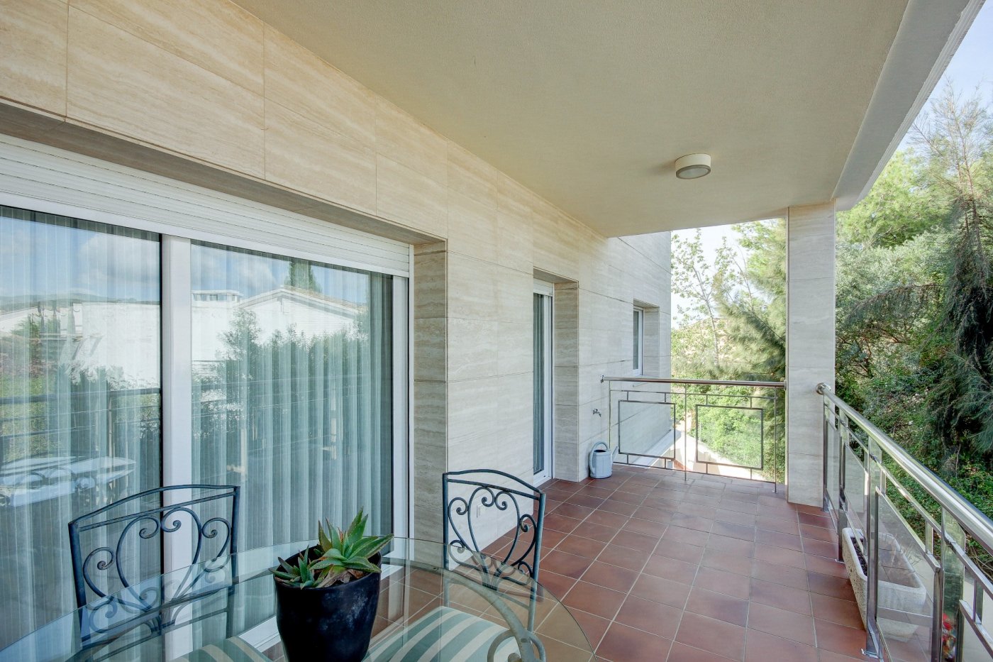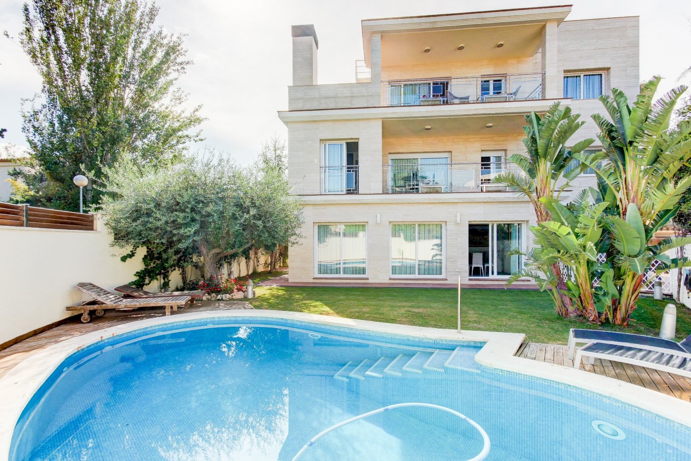 We present this splendid and elegant house in a privileged area of Sant Pere de Ribes.~ It has three floors and a semi-basement with lift between all of them.~ Ground floor: we are welcomed by a hall, which distributes the space towards the living-dining room, kitchen, a bedroom, a complete bathroom and another bedroom en suite, which can be used as a service room. The living-dining room is spacious and has three large windows overlooking the garden and a glazed fireplace. The kitchen is independent and equipped with a table and two windows that provide light. The exterior part that surrounds almost all the house, consists of a part that is a garden of natural grass with automatic irrigation and a swimming pool that has an automatic system of cleaning and ph control, and the other exterior part is a terrace-porch.~ Access to the first floor is via a wooden staircase with a maritime feel. Here we find three exterior bedrooms with pleasant views, one of them very spacious, en suite and currently used as an office. Two bedrooms share a bathroom and have access to a terrace.~ The top floor surprises us with a mini flat: hall-living room, then a dressing room and the master bedroom with bathroom with separate shower and bathtub with hydromassage. The rooms have access to a generous terrace that almost surrounds this floor, where we can enjoy relaxing surrounded by marvellous open views to the four winds. External stairs give access to another upper terrace where some services are located, such as air conditioning and solar panels. ~ On the semi-basement floor is the garage, with space for three cars, a multi-purpose room (currently a small gym), complete bathroom, air-conditioned wine cellar, maintenance rooms for the swimming pool and supplies for the house.~ All the rooms have built-in wardrobes, electric blinds and the electrical installation is sectored.~ This house is characterised by its pleasant design, the stately travertine marble façade, combined with the comfortable and cosy style of the construction, and by the comfort: you could move in tomorrow thanks to the care taken in the maintenance and details related to the supplies.~ The location is excellent, next to the access road to the motorways and the bus stop to Sitges and Vilanova.~ ~